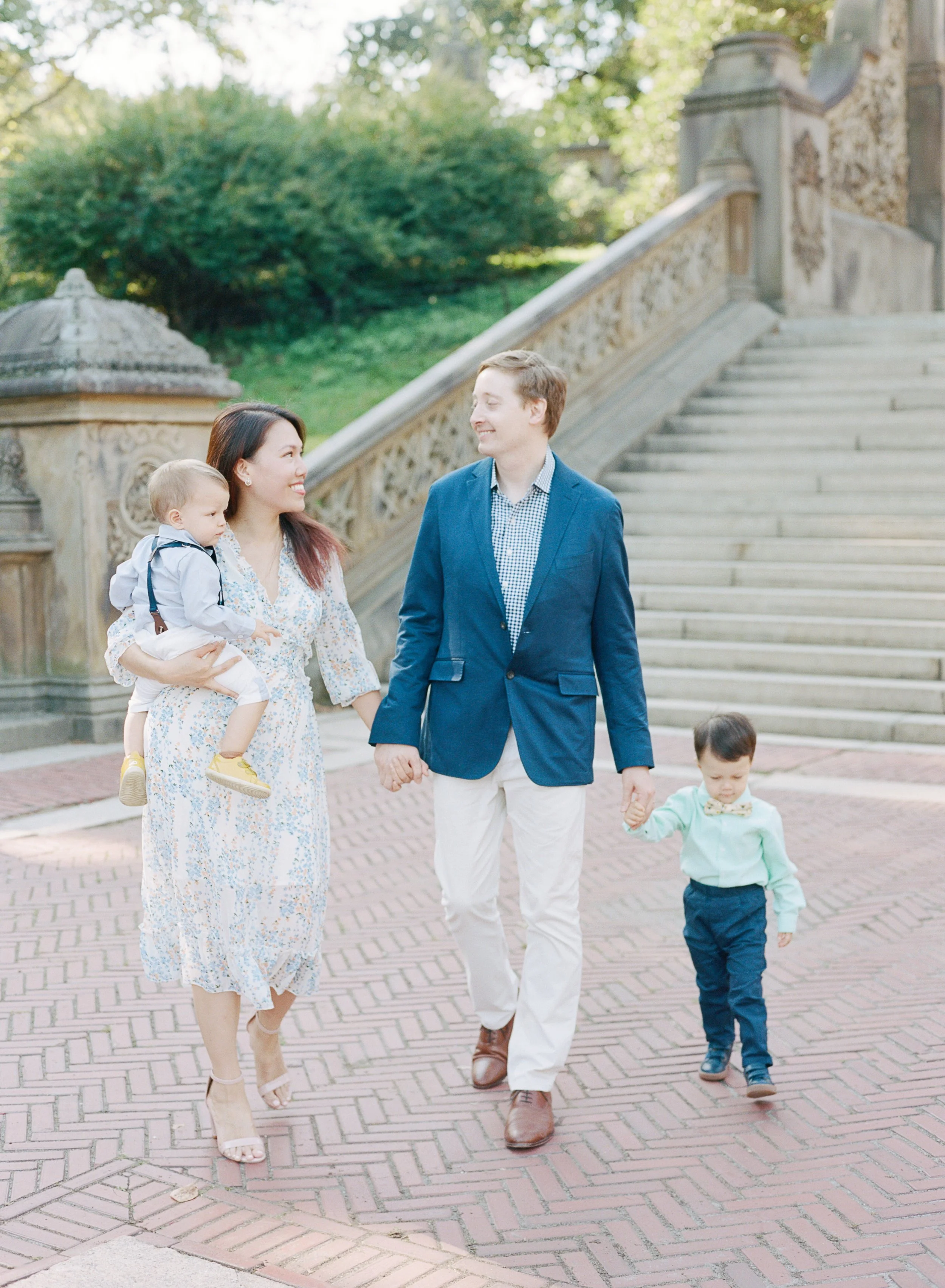 Bethesda Fountain & Terrace - Perhaps the most iconic spot in all of Central Park, the Bethesda Fountain and its surrounding terrace offer grandeur and architectural beauty. The Angel of the Waters statue creates a stunning focal point, and the wide stone steps make for natural, relaxed posing. This location works beautifully for families of all sizes.